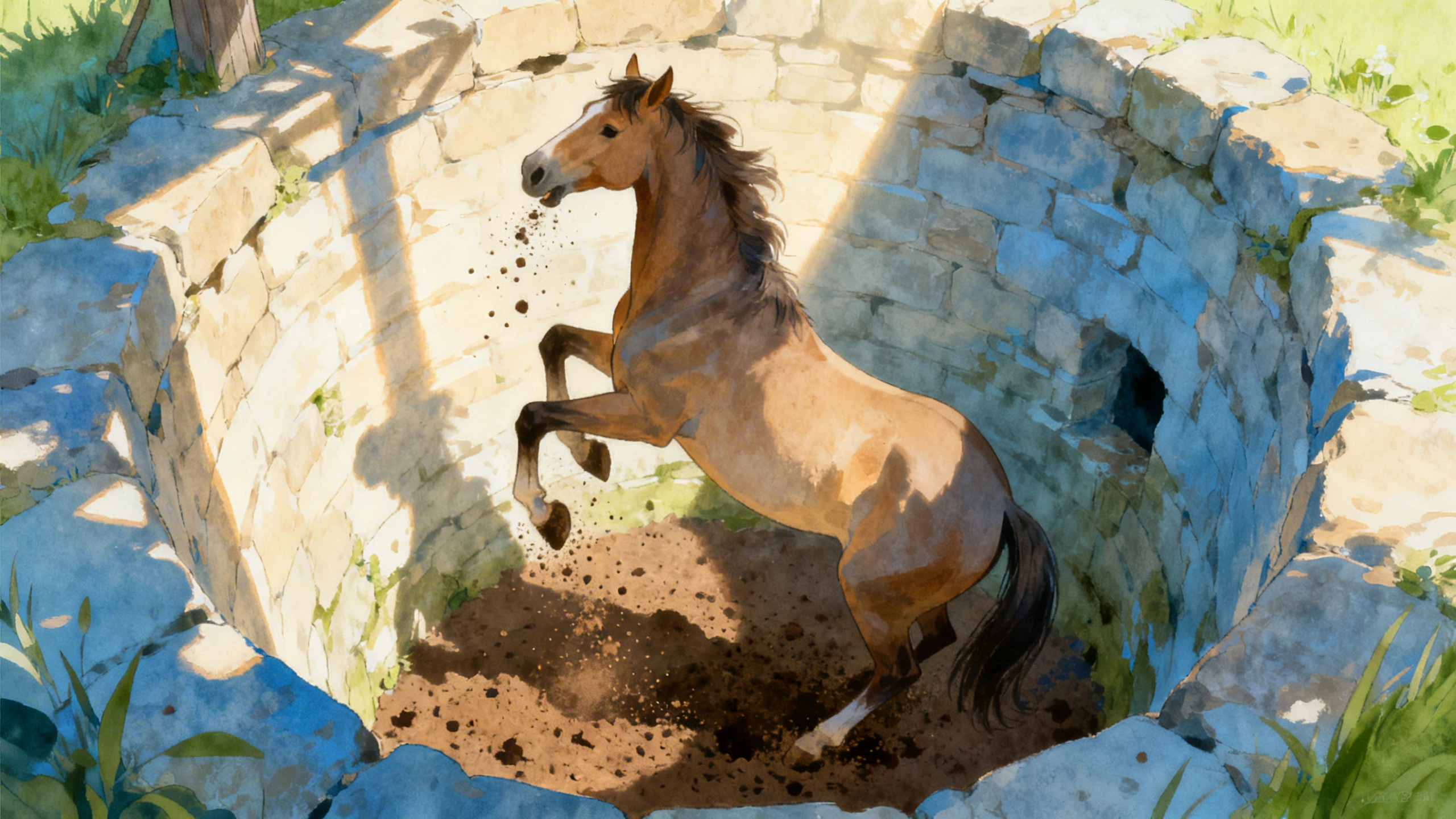 Um fazendeiro, que lutava com muitas dificuldades, possuía alguns cavalos para ajudar nos trabalhos em sua pequena fazenda. Um dia, o capataz veio trazer-lhe a notícia de que um dos cavalos havia caído num velho poço abandonado. O poço era muito profundo e seria extremamente difícil tirá-lo de lá.